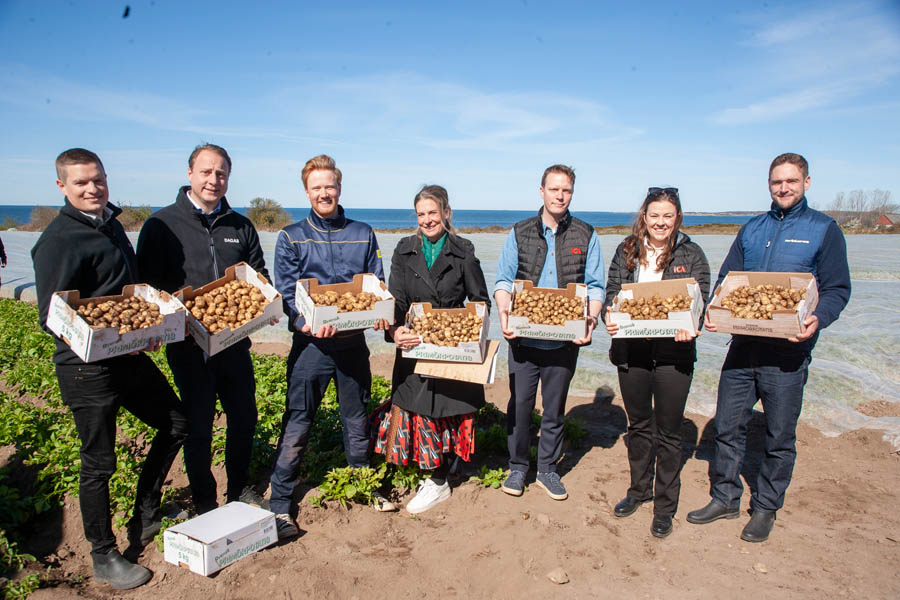 Årets första frilandsodlade färskpotatis plockades på Bjärehalvön igår, tisdag. Det blev en potatisfest, men framför allt ett manifest där odlare, de stora kedjorna i svensk dagligvaruhandel tillsammans med Svensk Potatis hyllade en fantastisk liten knöl. Leve svensk färskpotatis! Det skriver Svensk Potatis AB.